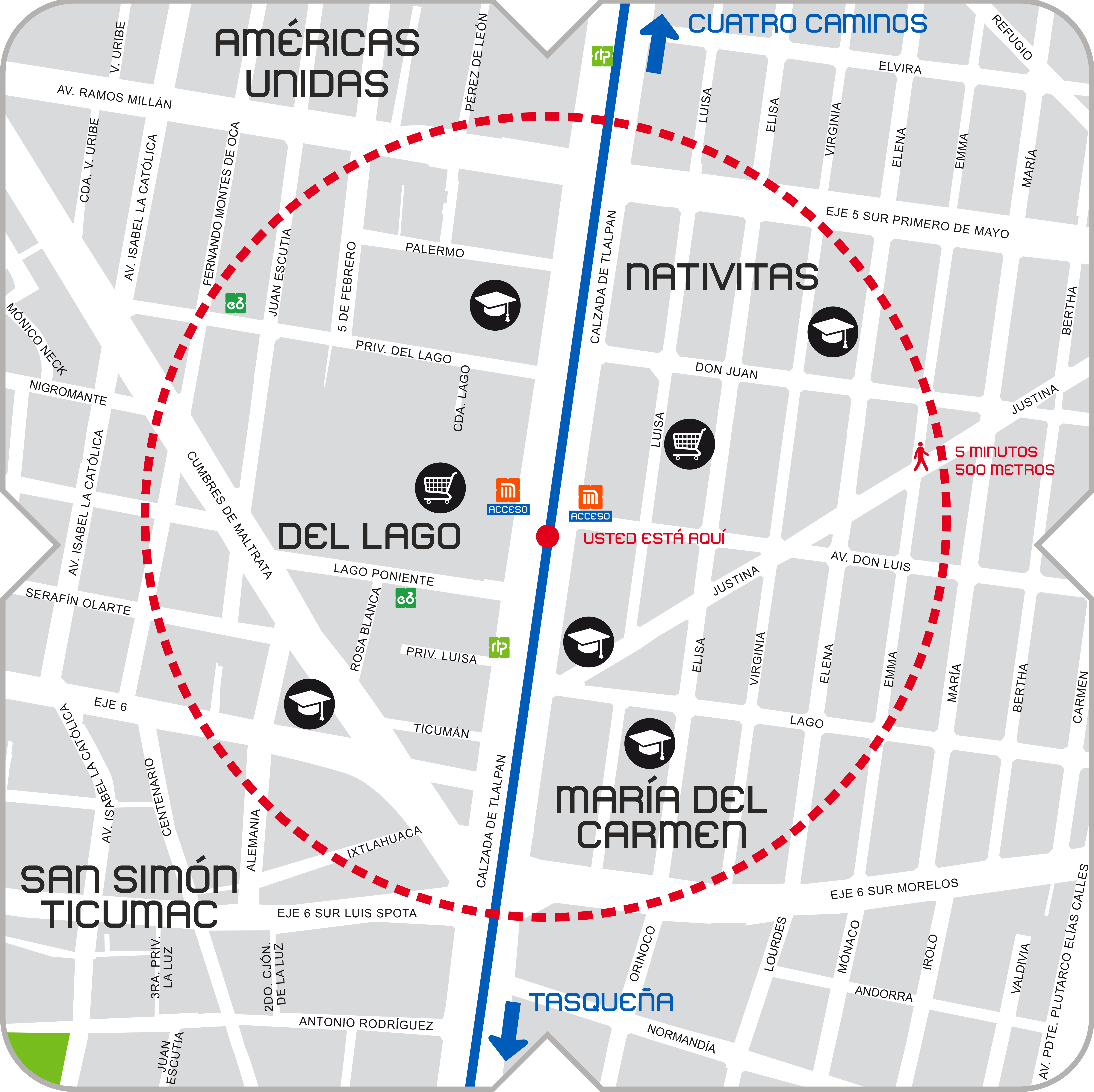 - Oriente: Av. Justina, Colonia Nativitas.