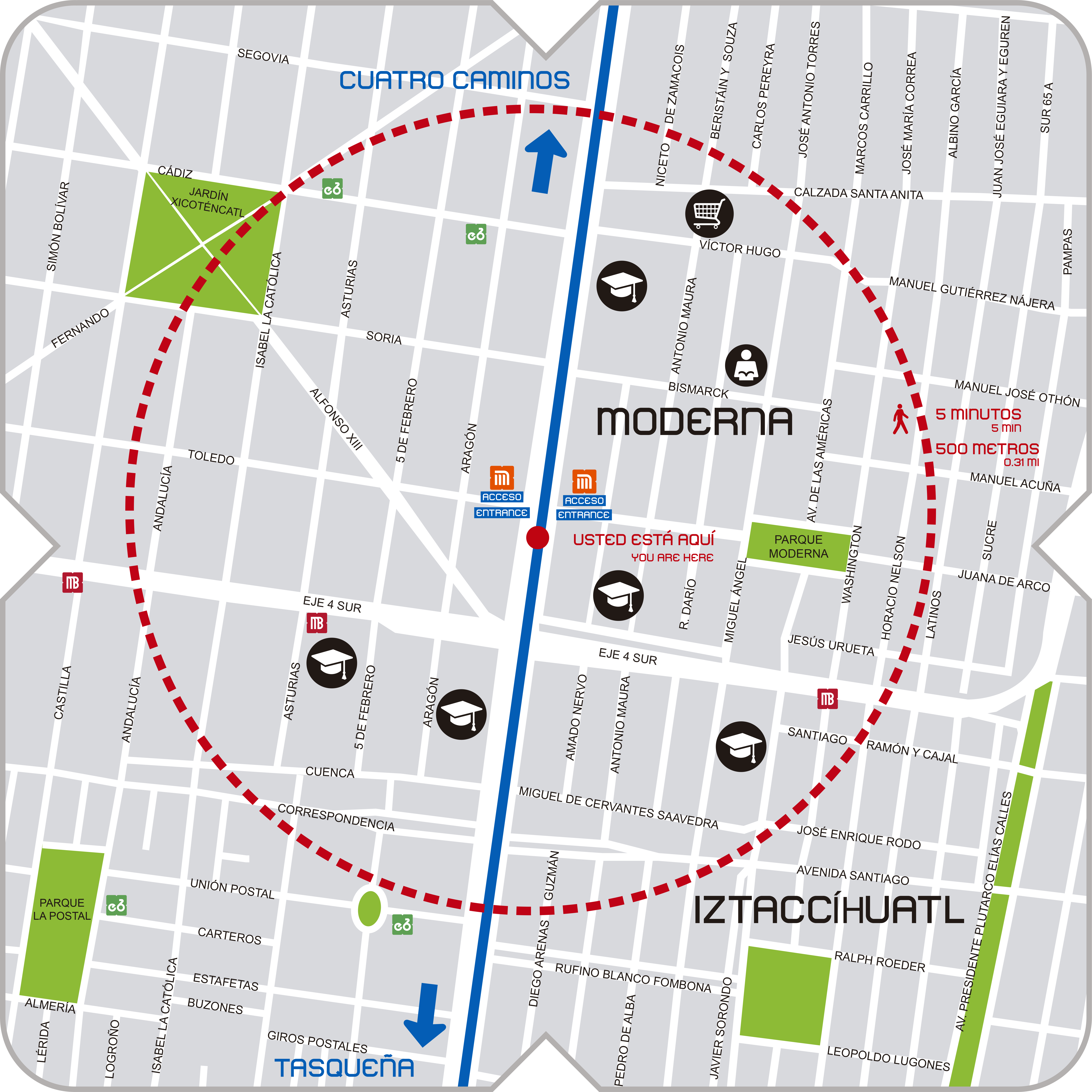 - Oriente: Entre calle Juana de Arco, Napoleón y Calzada de Tlalpan, Colonia Moderna.