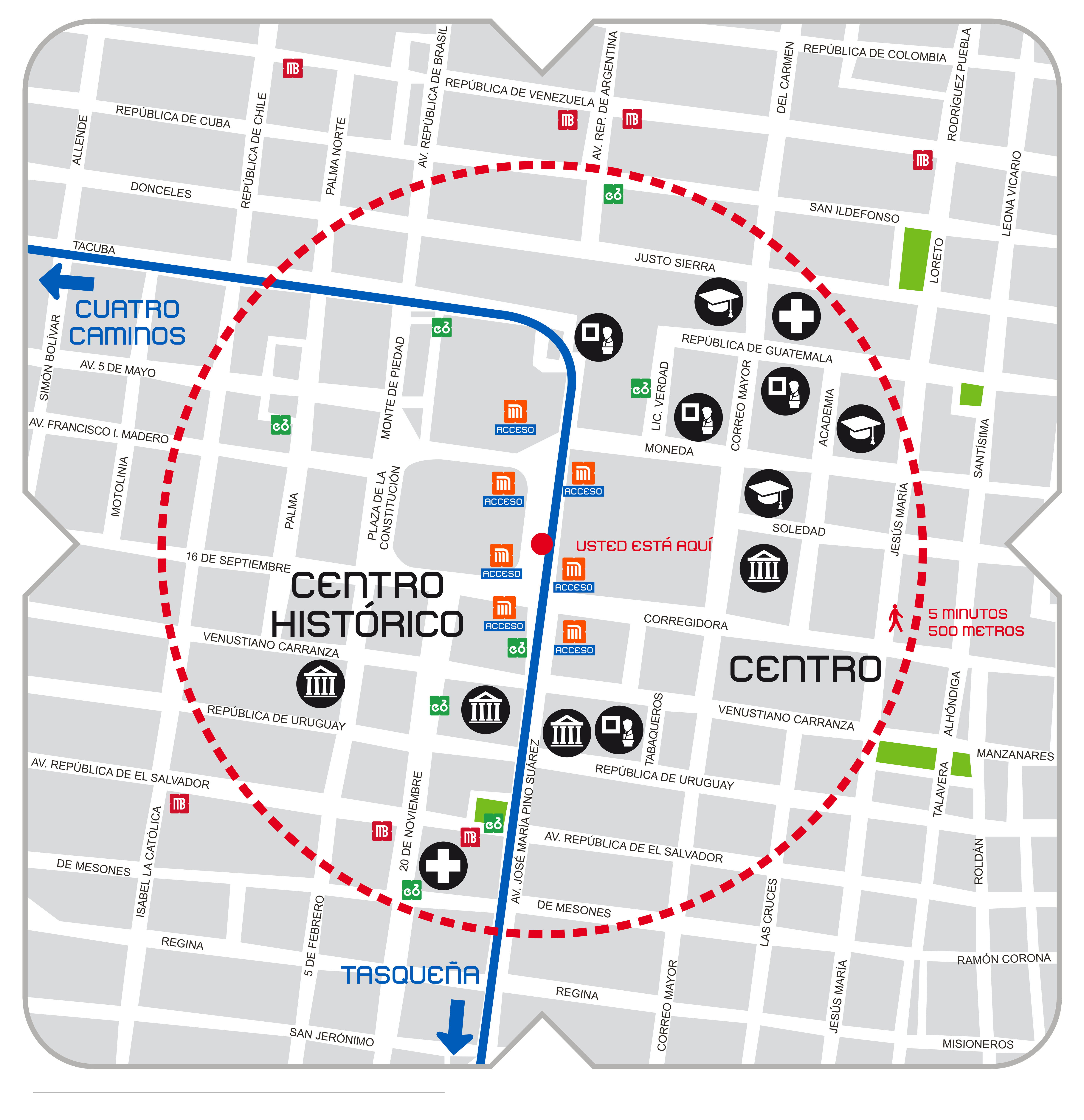 - Suroriente: Avenida Pino Suárez esquina Corregidora (junto a la Suprema Corte de Justicia de la Nación), Colonia Centro.